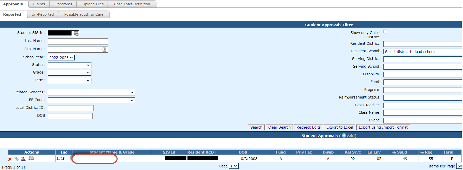 To Edit a Student Approval record, simply click on the name of the student located below the Student Search Filter.
