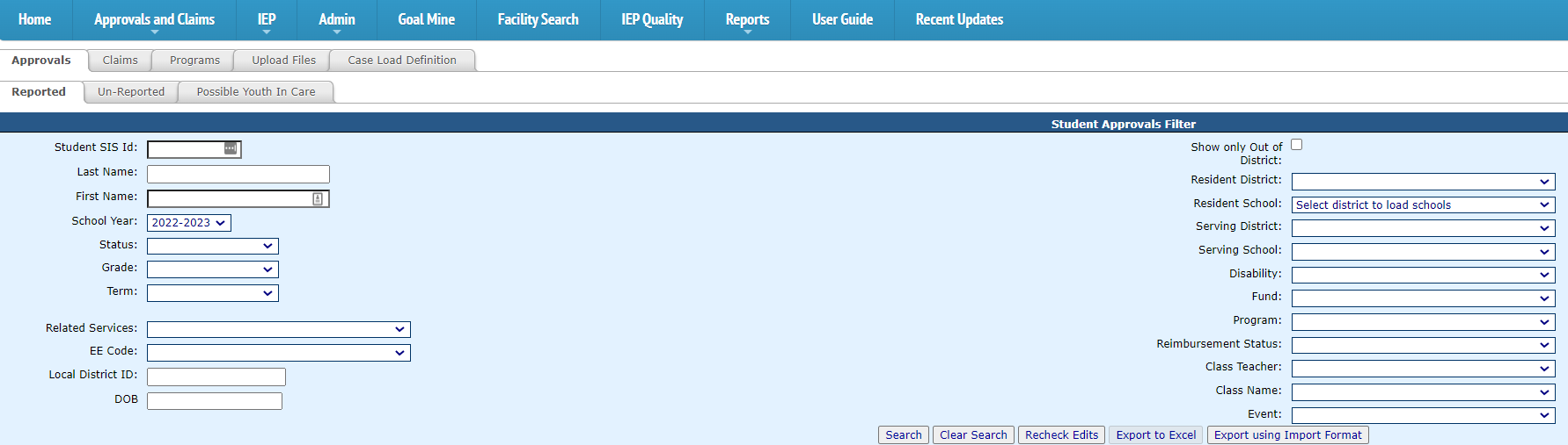 You can search for students by several different filters such as Student SIS ID, Last Name, First Name, School Year, Status, Grade, Term, Tuition Status, Resident District, Resident School, Serving District, Serving School, Disability, Fund, Class Teacher, Class Name, and/or Event.