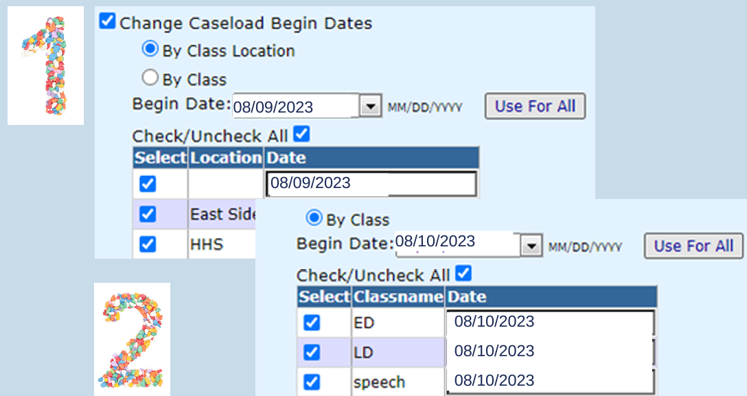 OPTIONAL: After the MANDATORY piece of Mass Change is addressed (Change Student Approval Begin Dates), users may also choose to Change Caseload Begin Dates. Simply click the box to Change Caseload Begin Dates by EITHER Class Location or by Class.