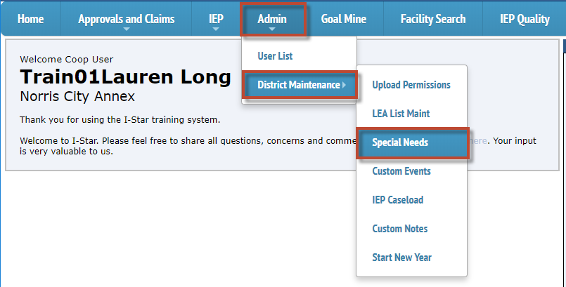 Step 1: To add a Special Needs Definition from the Admin drop-down menu, click District Maintenance and Special Needs.