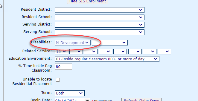 7. Edit the existing date in the begin date box. The begin date should be the student's date of birth UNLESS the re-evaluation was held after the 10th birthday. In that case, the begin date will be the date of the re-evaluation (See further steps below titled "Missed Re-Evaluation)
