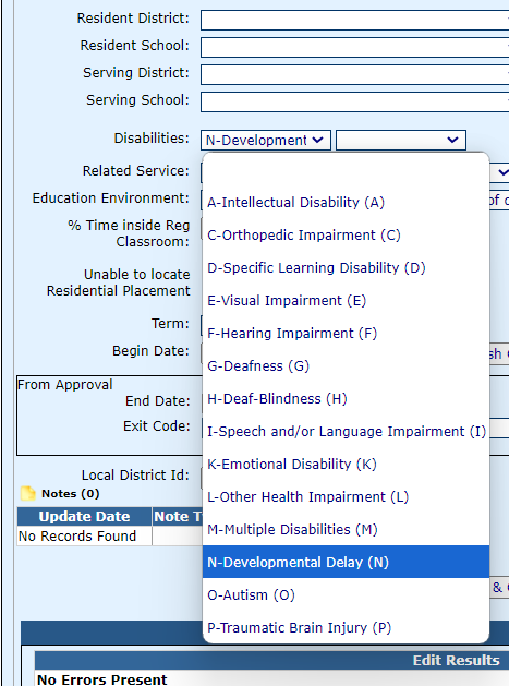Disability N: DEVELOPMENTAL DELAY: This code may be used only for students ages 3 through 9 who are experiencing delay in physical development, cognitive development, communication development, social or emotional development, or adaptive development. When the student becomes 10 years old, this code becomes an error. Updating this code is accomplished in I-Star by performing an End/Add.